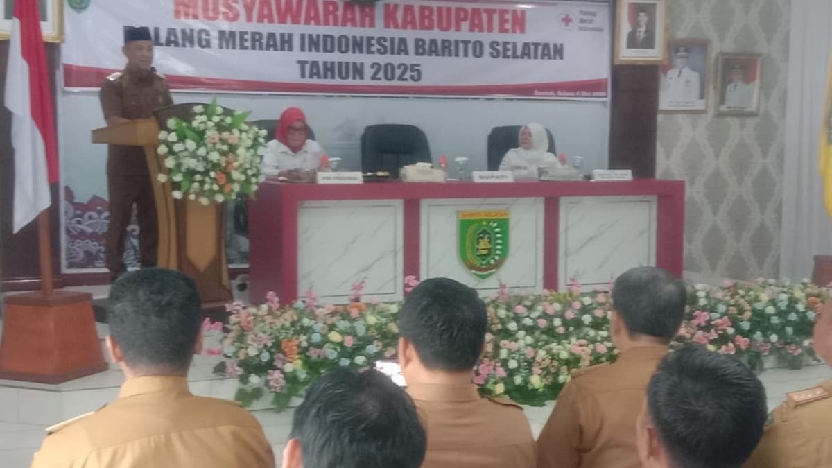 Bupati Barito Selatan Eddy Raya Samsuri memberikan sambutan dalam acara Musyawarah Kabupaten dan pelantikan Pengurus PMI Barito Selatan periode 2025–2030 yang digelar di Aula Kantor Bupati Barsel pada Senin, 6 Mei 2025. (foto: GeloraNews.co/mas)
