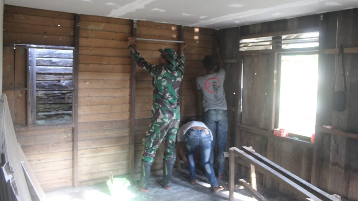 Dengan suasana penuh kebersamaan, personel Satgas TMMD bersama warga setempat terlihat kompak bahu membahu menyelesaikan pembangunan RTLH secara bertahap.